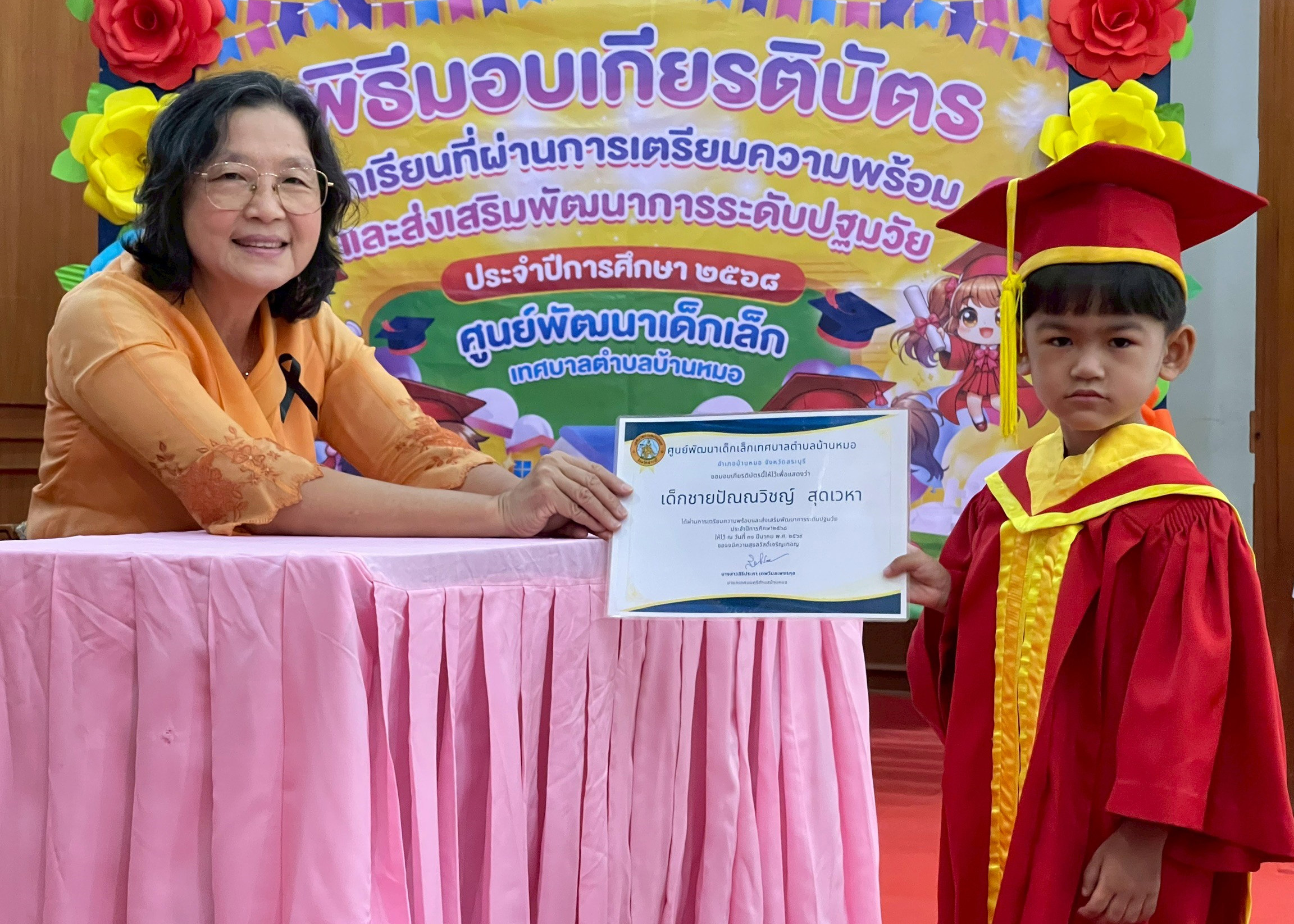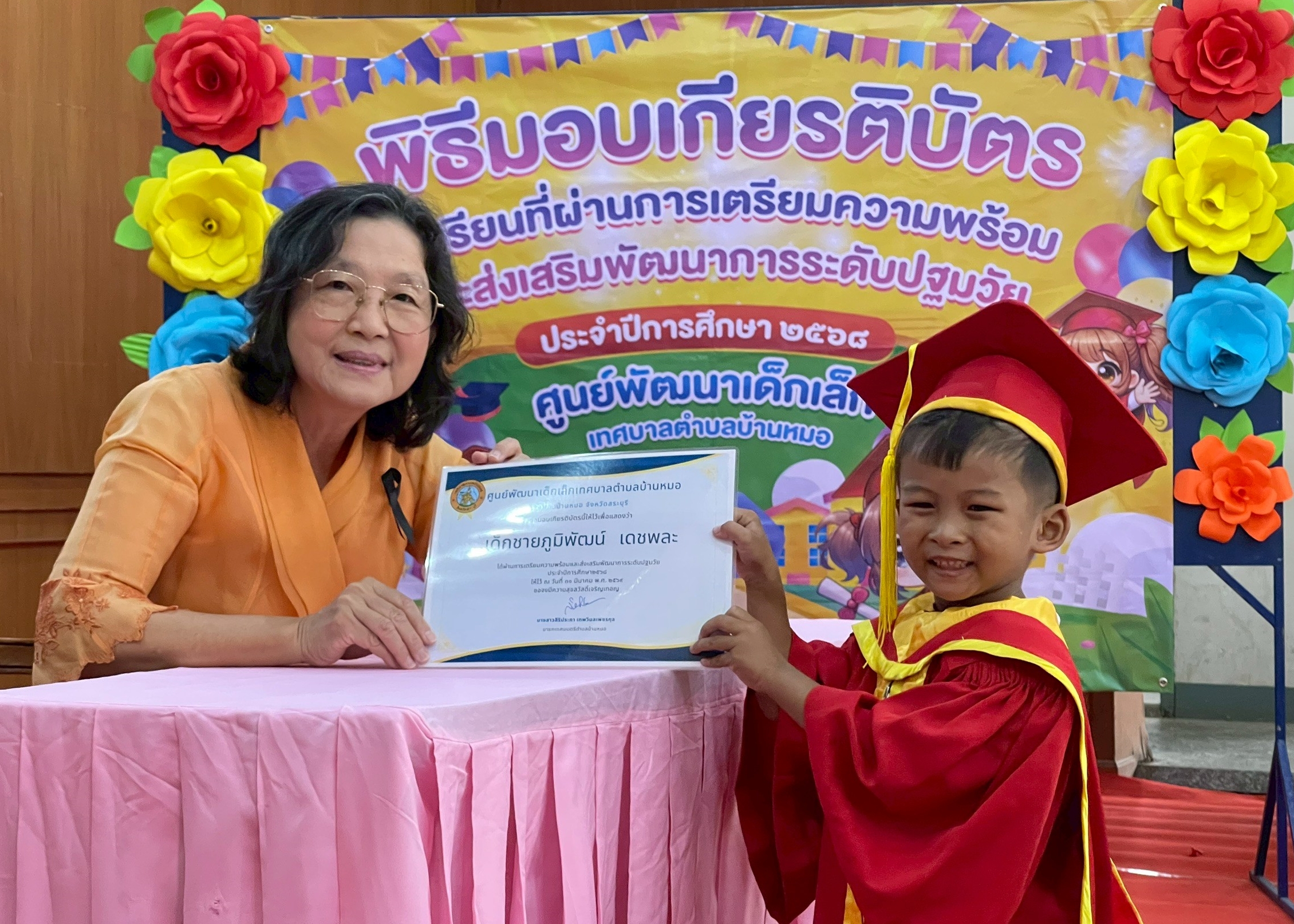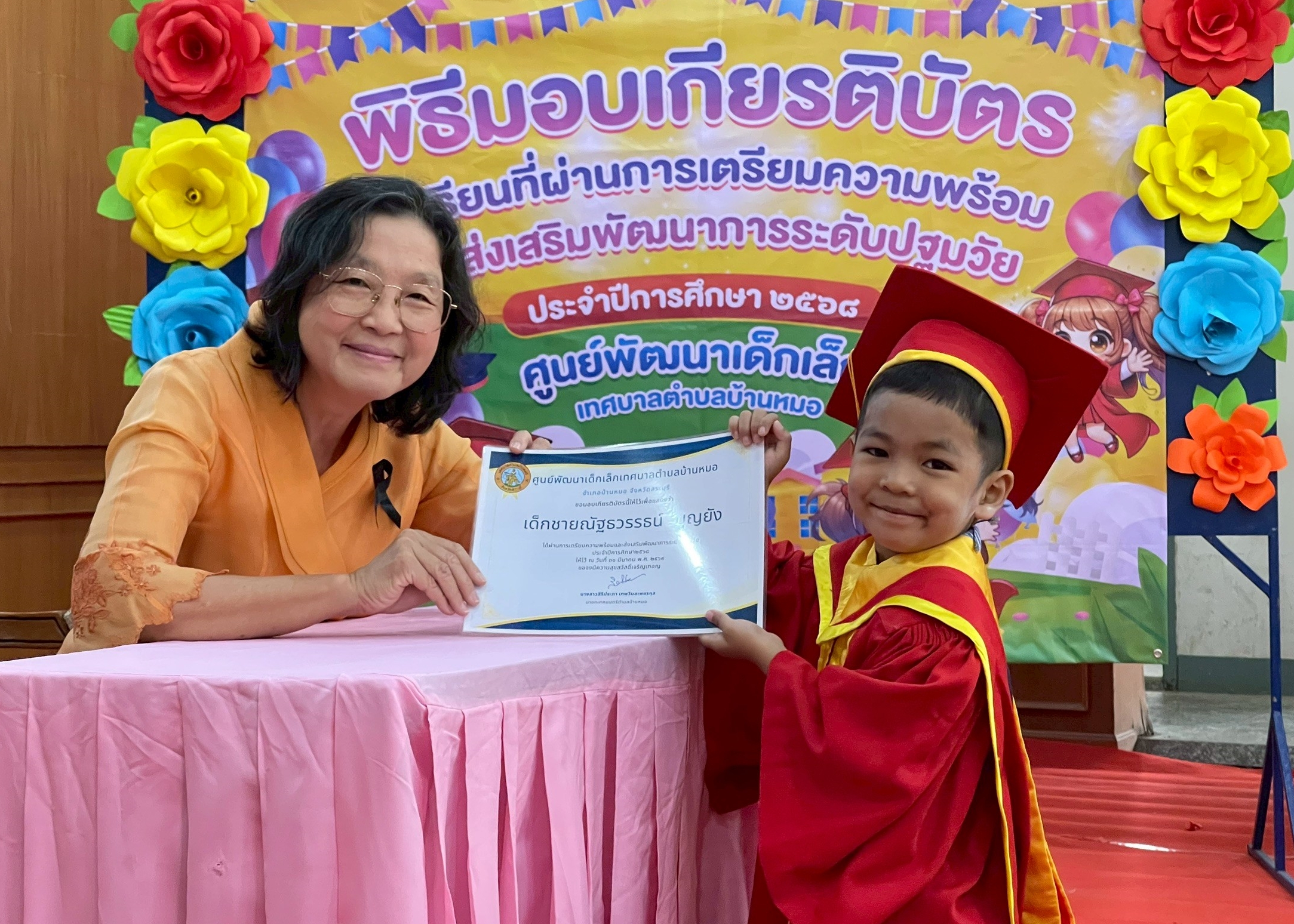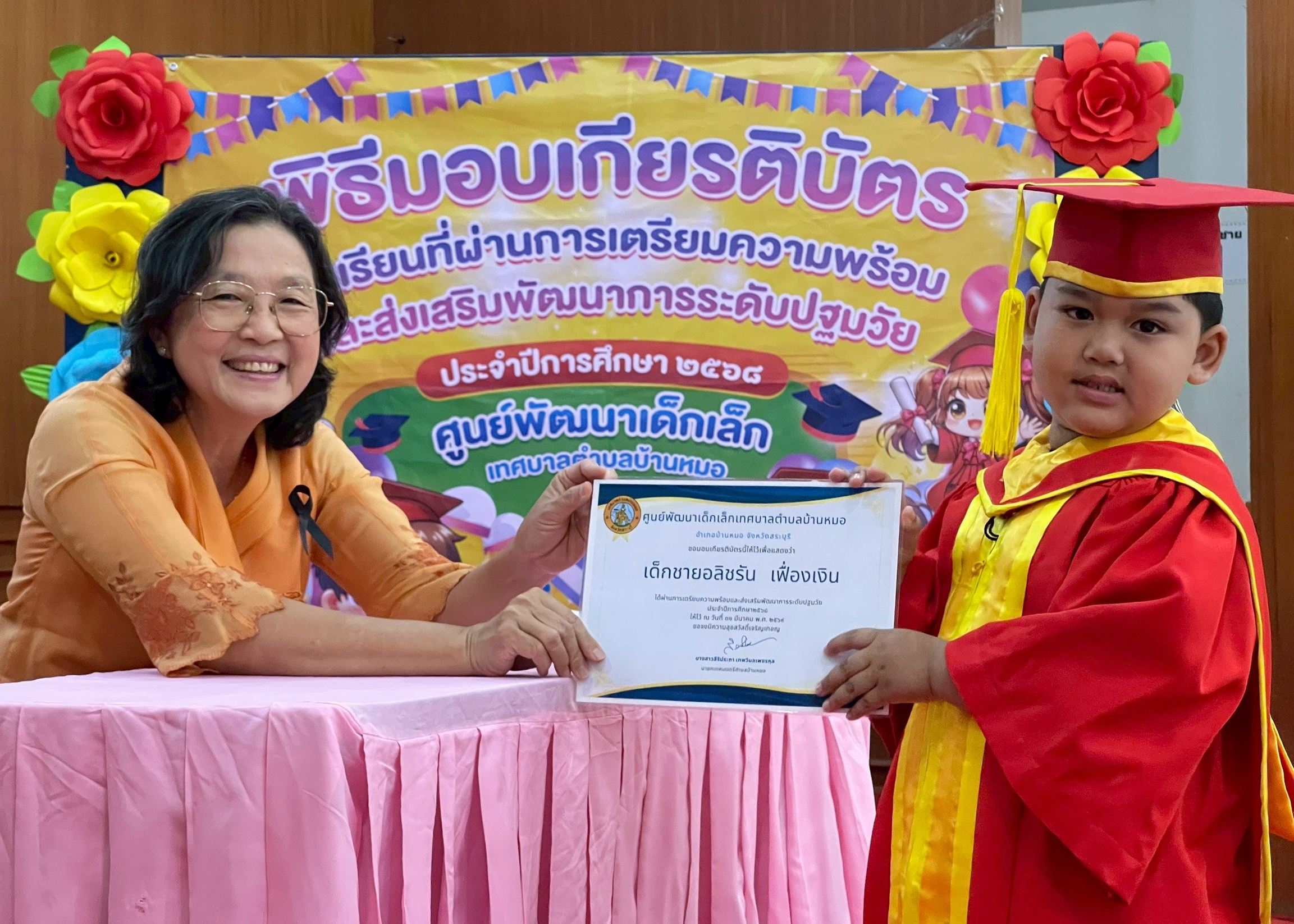 จัดพิธีมอบเกียรติบัตร นักเรียนที่ผ่านการเตรียมความพร้อมและส่งเสริมพัฒนาการระดับปฐมวัย ประจำปีการศึกษา 2568 ของศูนย์พัฒนาเด็กเล็กเทศบาลตำบลบ้านหมอ ซึ่งมีผู้สำเร็จการศึกษาจำนวน 35 คน โดยมีผู้ปกครองมาร่วมแสดงความยินดีกับน้องๆ ท่ามกลางบรรยากาศสุดชื่นมื่น ณ ศาลาประชาคมเทศบาลตำบลบ้านหมอ