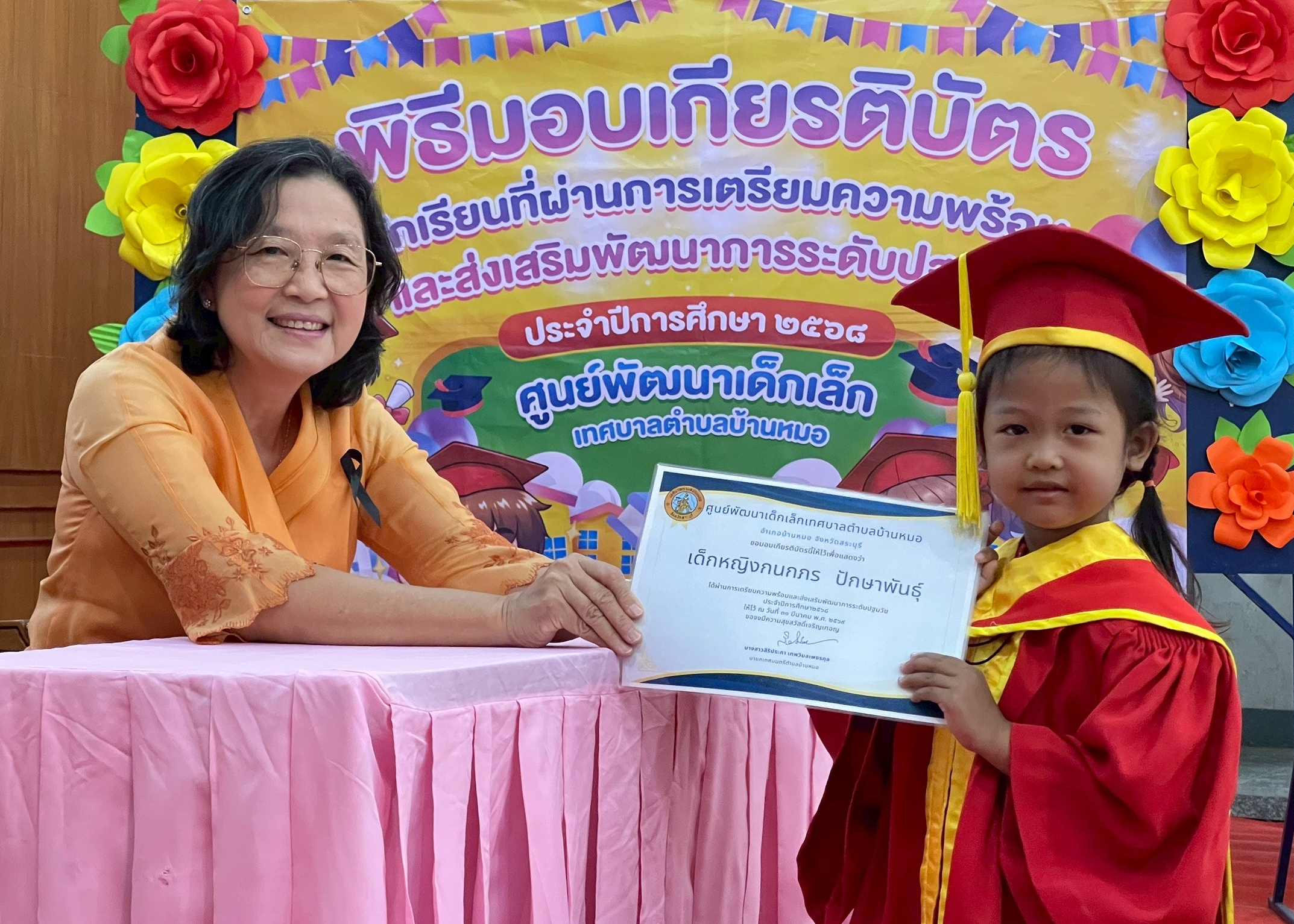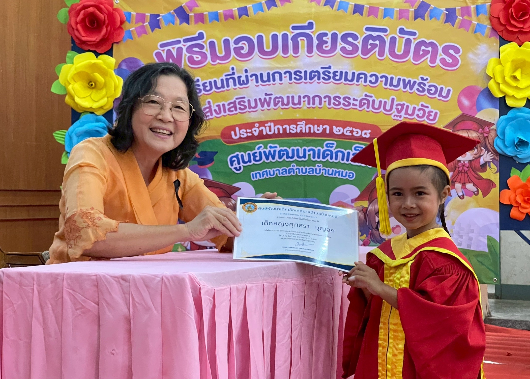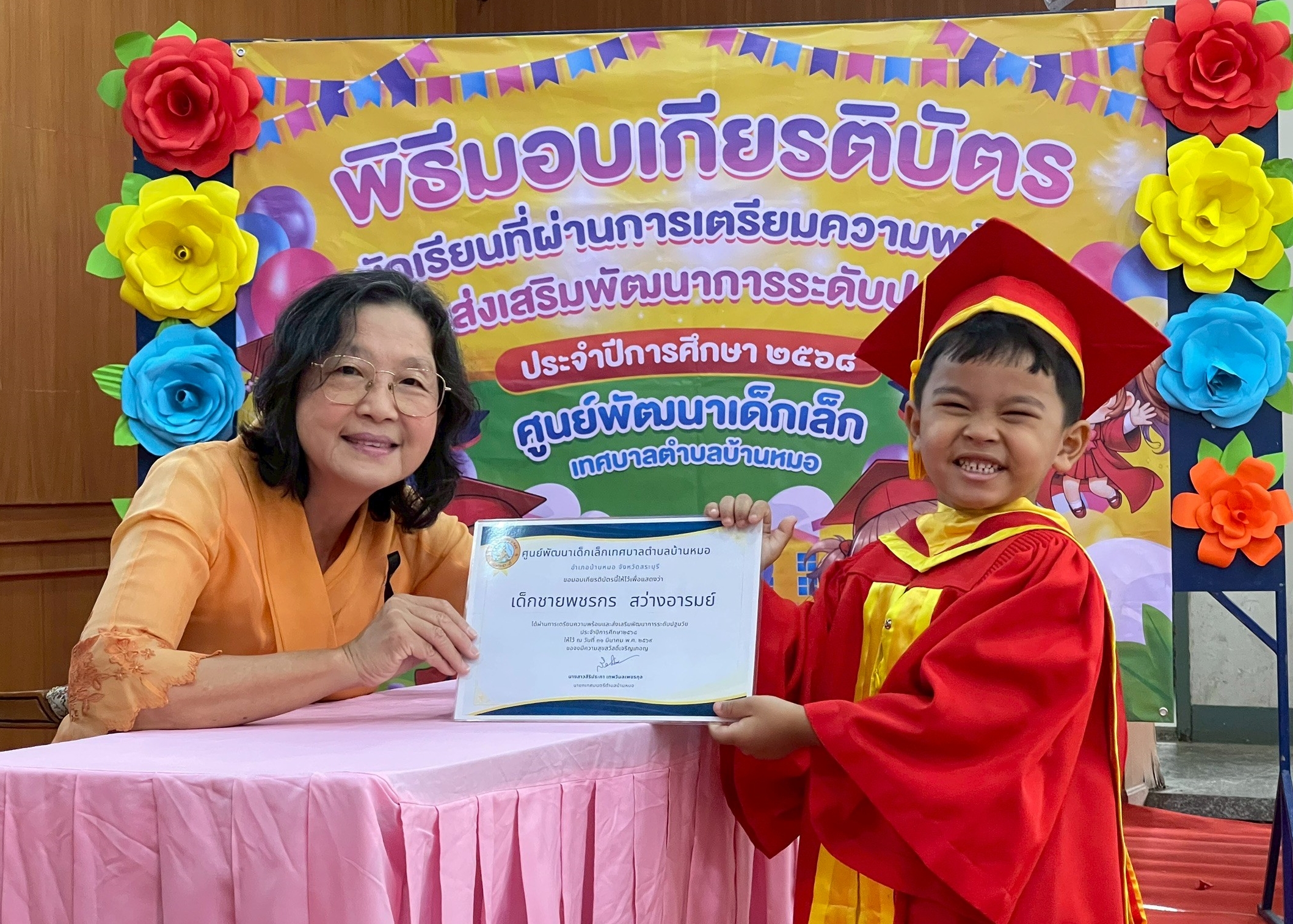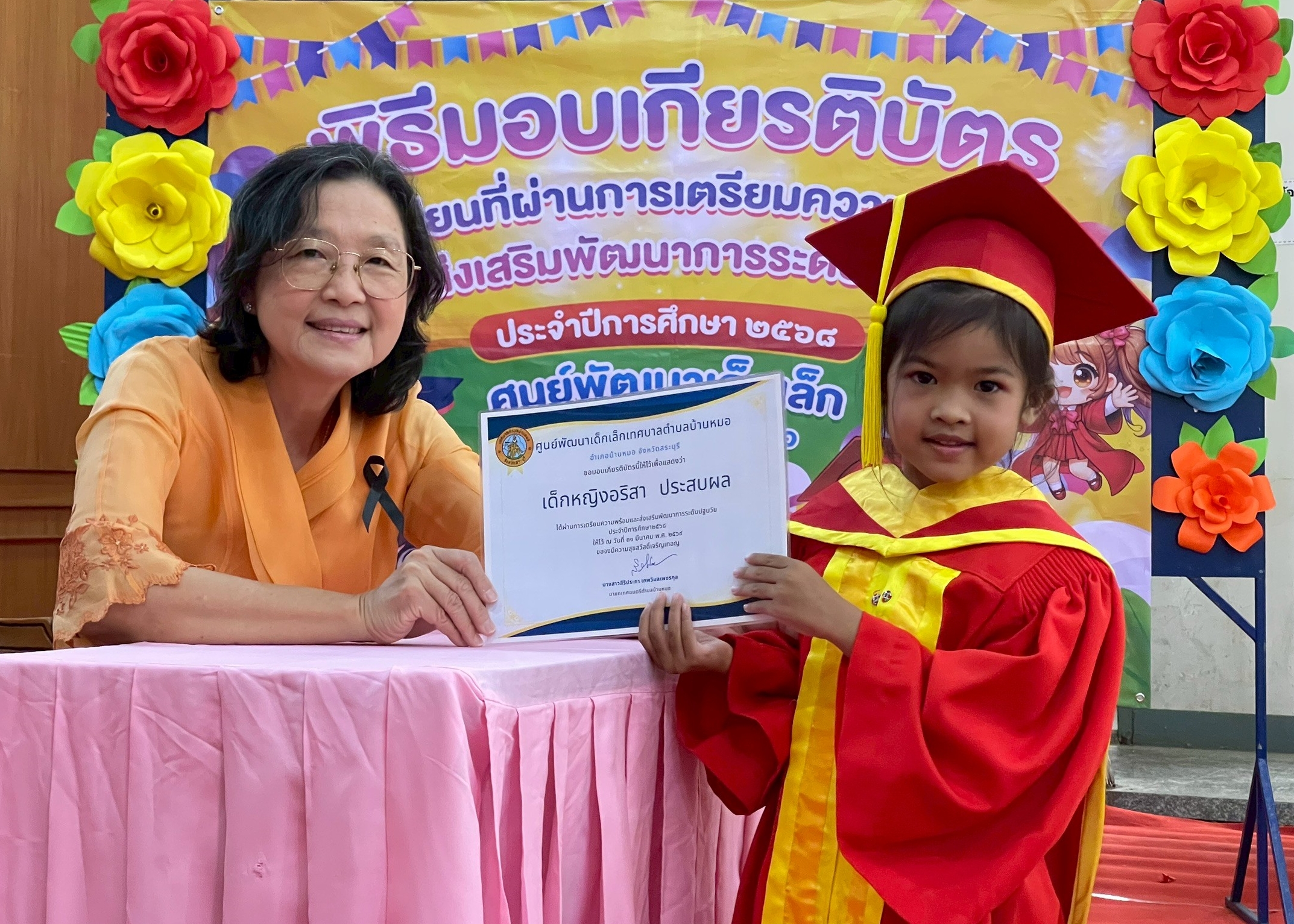 จัดพิธีมอบเกียรติบัตร นักเรียนที่ผ่านการเตรียมความพร้อมและส่งเสริมพัฒนาการระดับปฐมวัย ประจำปีการศึกษา 2568 ของศูนย์พัฒนาเด็กเล็กเทศบาลตำบลบ้านหมอ ซึ่งมีผู้สำเร็จการศึกษาจำนวน 35 คน โดยมีผู้ปกครองมาร่วมแสดงความยินดีกับน้องๆ ท่ามกลางบรรยากาศสุดชื่นมื่น ณ ศาลาประชาคมเทศบาลตำบลบ้านหมอ